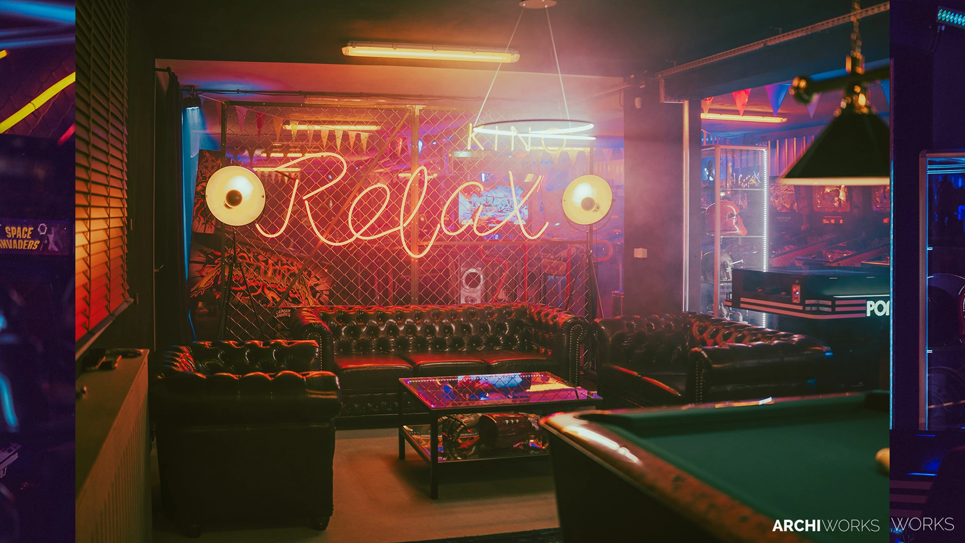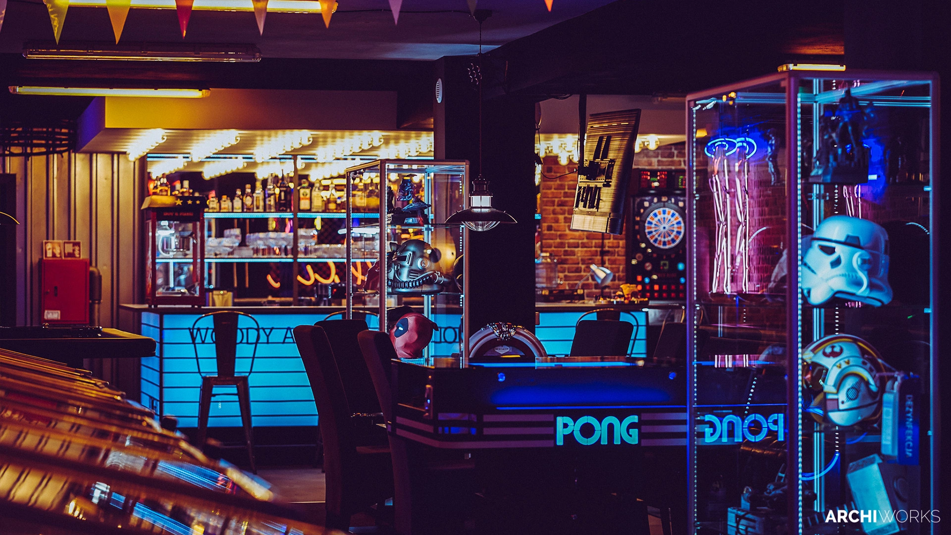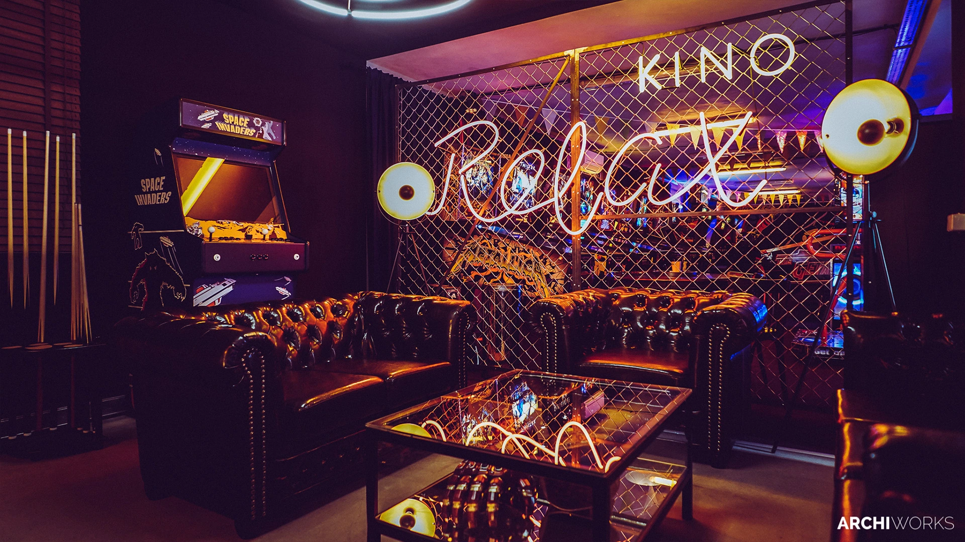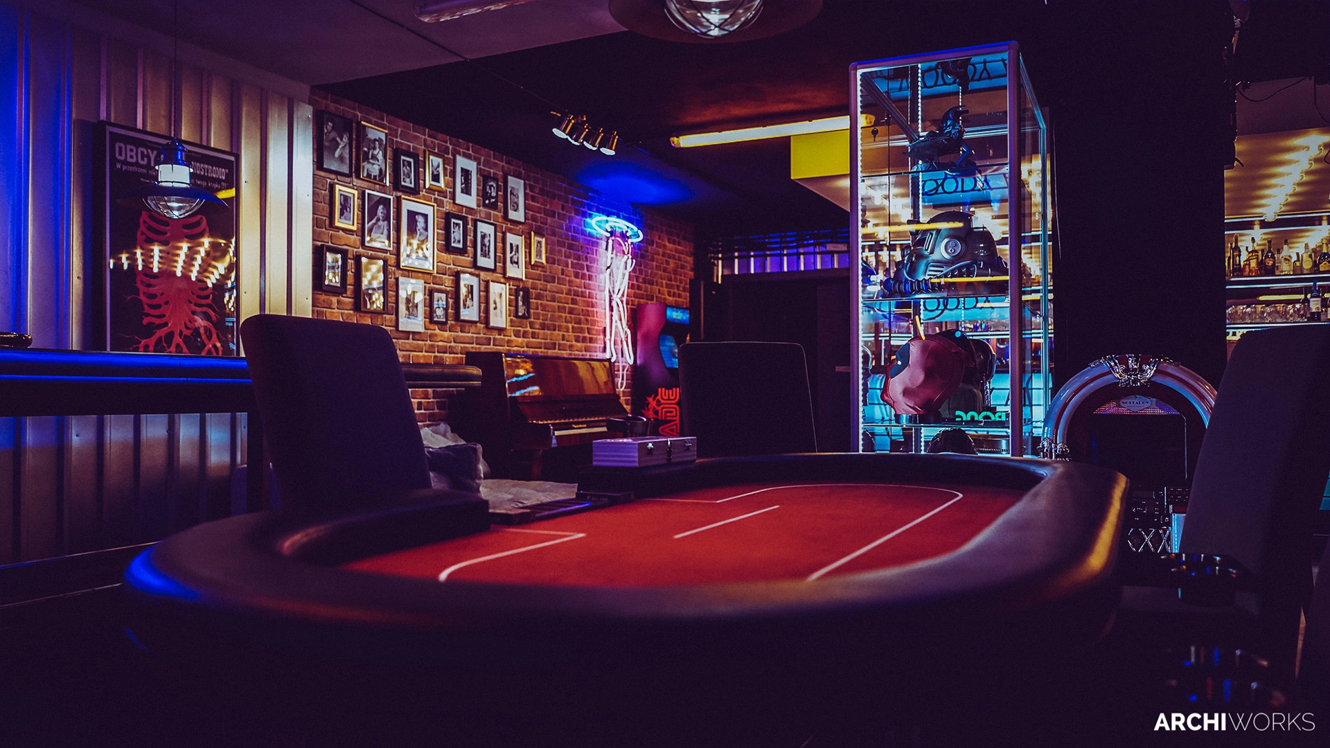 Projekt przestrzeni barowo-rozrywkowej dla prywatnego inwestora to wyrazisty miks estetyki retro z klimatem neonowego blichtru lat 80. i 90. Wnętrze zostało zaprojektowane jako osobna rzeczywistość — nostalgiczną, ale w pełni współczesną. Na pierwszym planie gra światło: kolorowe neony, podświetlane gabloty z kolekcjonerskimi hełmami oraz charakterystyczny sufit z żarówkami tworzą aurę rodem z dawnych kin czy automatów do gier. W przestrzeni znalazły się również klasyczne flippery, stół bilardowy i automat Pong, a całość dopełniają skórzane sofy typu chesterfield, ceglane ściany i detale w stylu vintage. Bar z podświetlanym frontem inspirowany jest ladą biletową kina — każdy element tej przestrzeni opowiada historię o kulturze gier, filmu i rozrywki sprzed kilku dekad. Archiworks stworzyło miejsce, które balansuje na granicy nostalgii i współczesnego komfortu, idealne do spotkań, zabawy i zanurzenia się w atmosferze minionych lat.