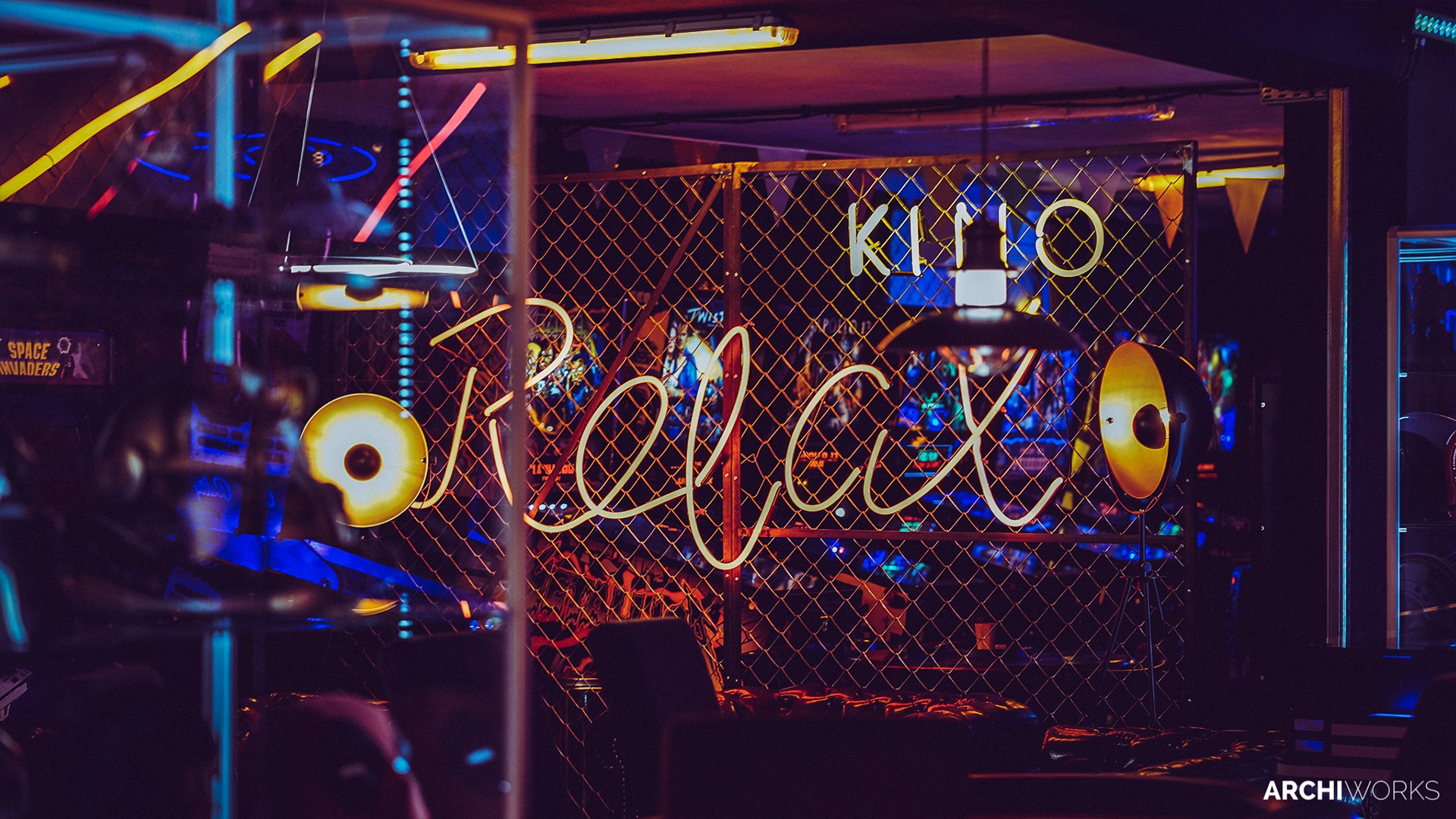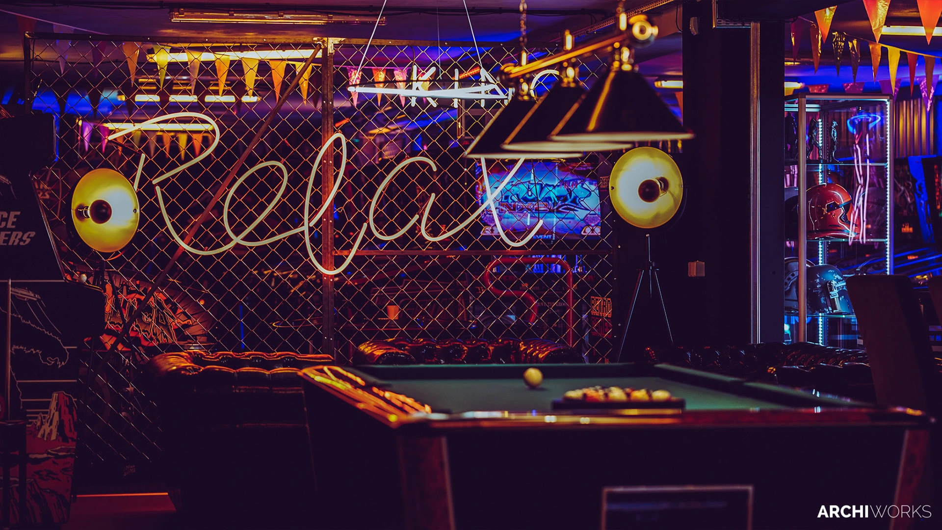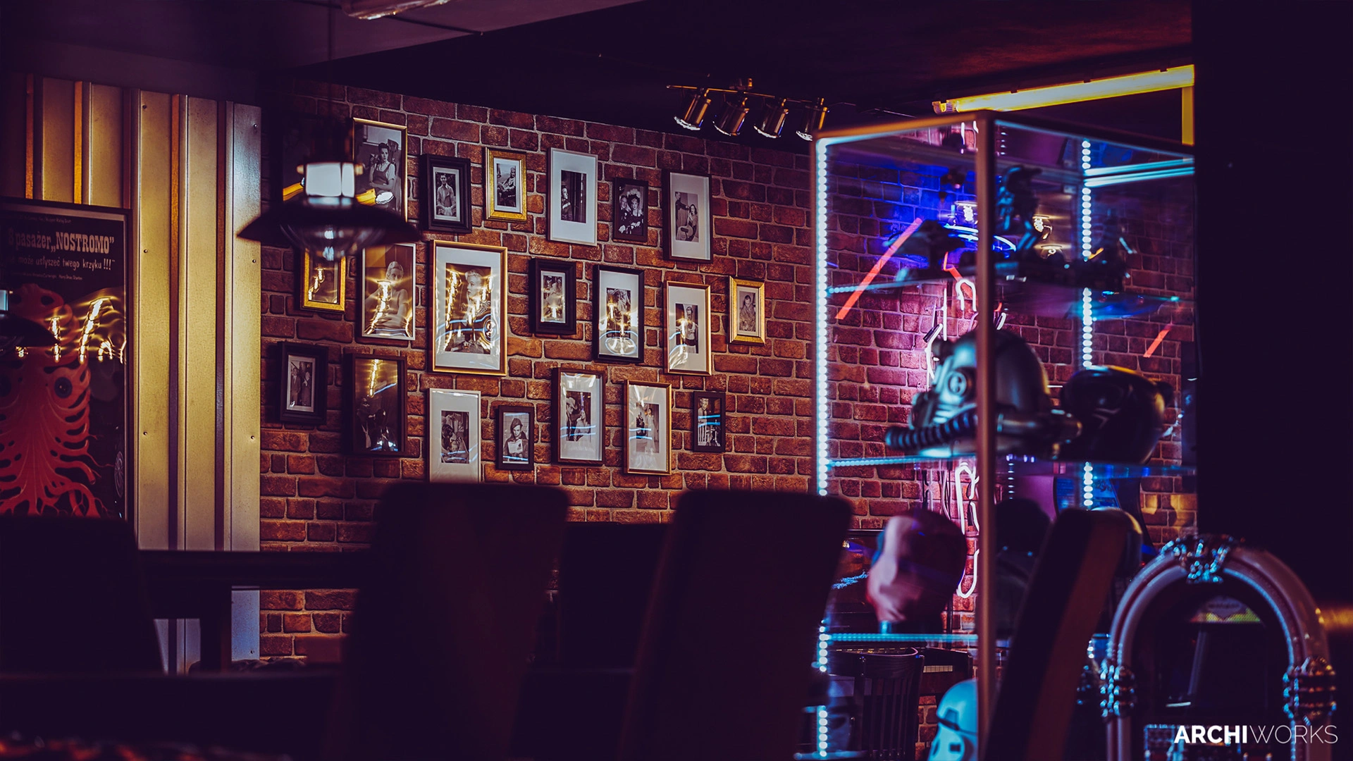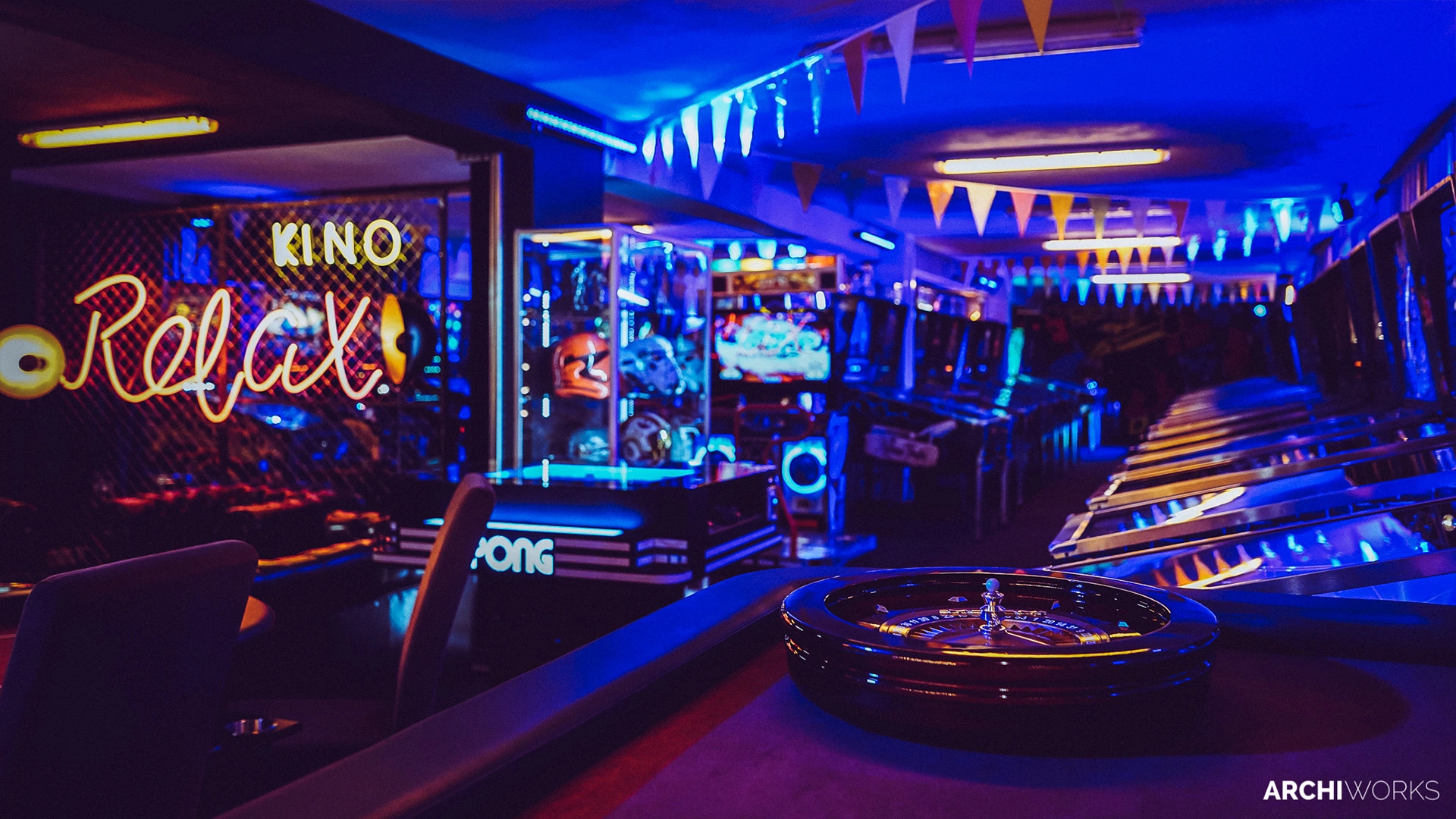 Projekt przestrzeni barowo-rozrywkowej dla prywatnego inwestora to wyrazisty miks estetyki retro z klimatem neonowego blichtru lat 80. i 90. Wnętrze zostało zaprojektowane jako osobna rzeczywistość — nostalgiczną, ale w pełni współczesną. Na pierwszym planie gra światło: kolorowe neony, podświetlane gabloty z kolekcjonerskimi hełmami oraz charakterystyczny sufit z żarówkami tworzą aurę rodem z dawnych kin czy automatów do gier. W przestrzeni znalazły się również klasyczne flippery, stół bilardowy i automat Pong, a całość dopełniają skórzane sofy typu chesterfield, ceglane ściany i detale w stylu vintage. Bar z podświetlanym frontem inspirowany jest ladą biletową kina — każdy element tej przestrzeni opowiada historię o kulturze gier, filmu i rozrywki sprzed kilku dekad. Archiworks stworzyło miejsce, które balansuje na granicy nostalgii i współczesnego komfortu, idealne do spotkań, zabawy i zanurzenia się w atmosferze minionych lat.