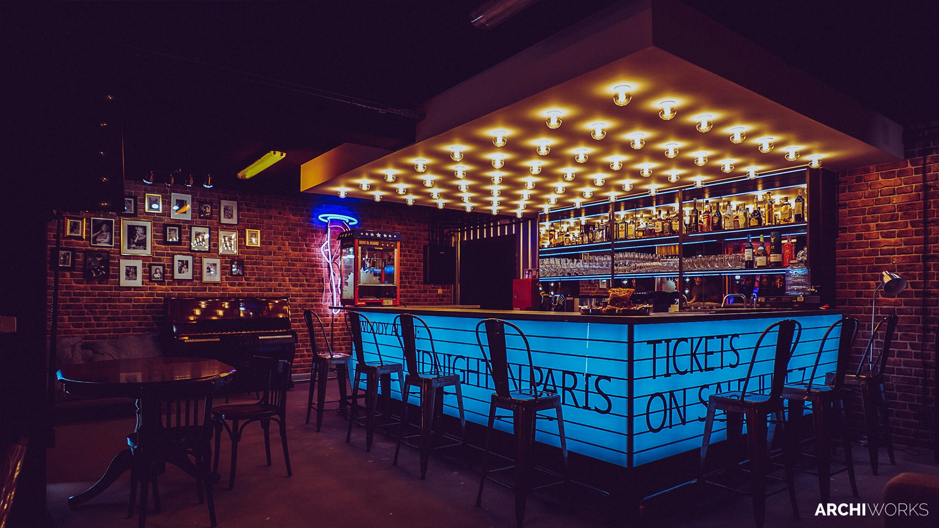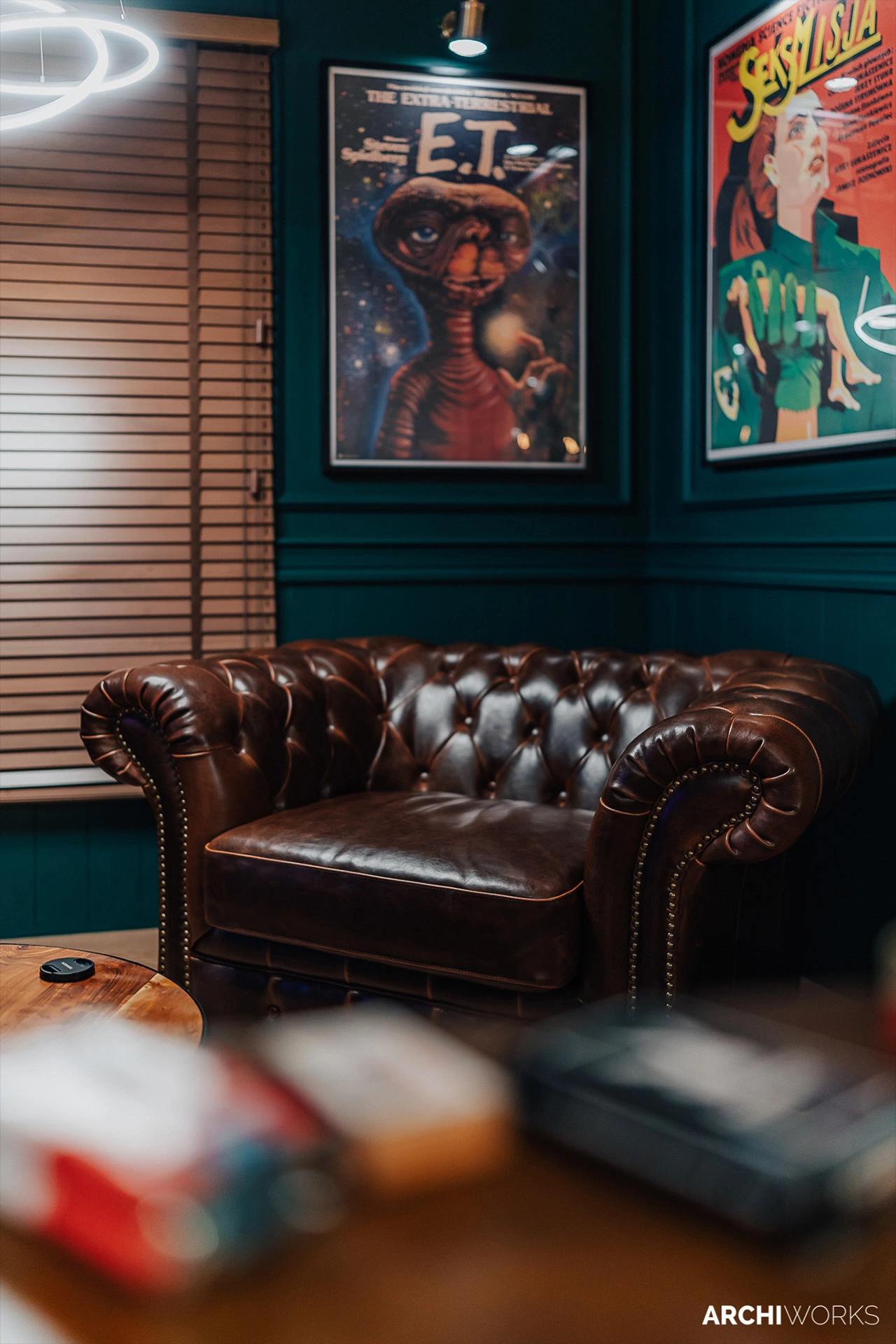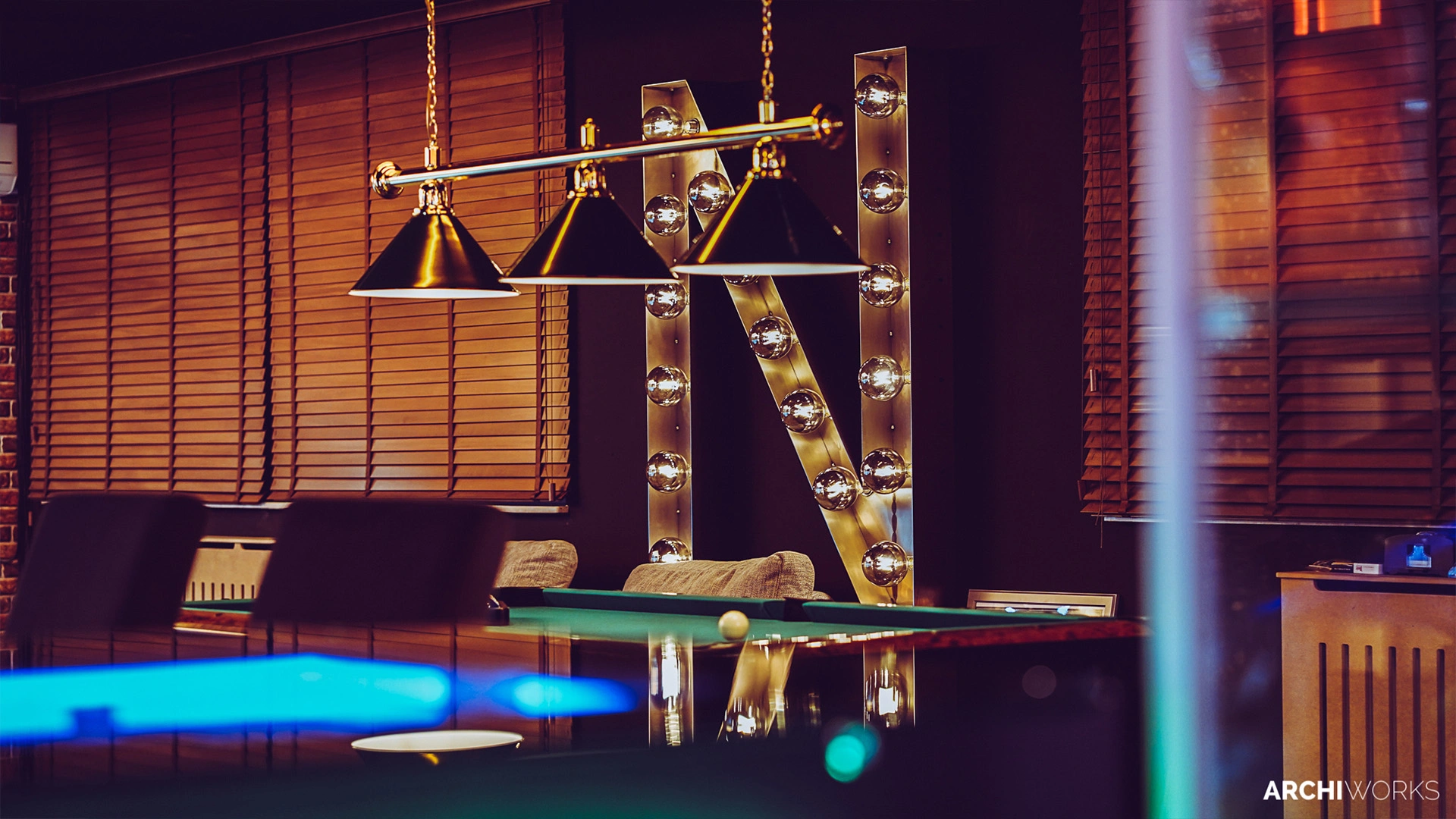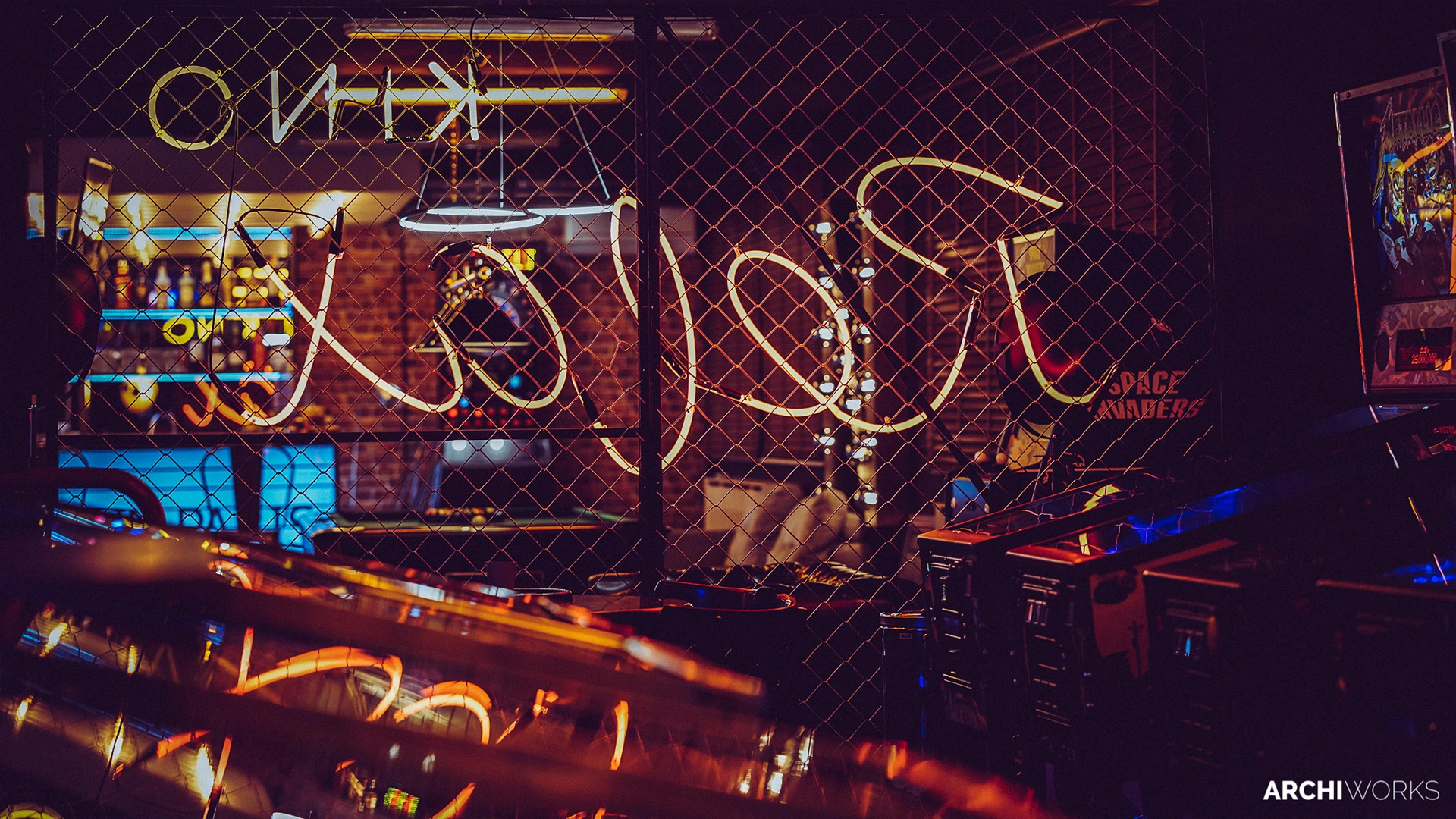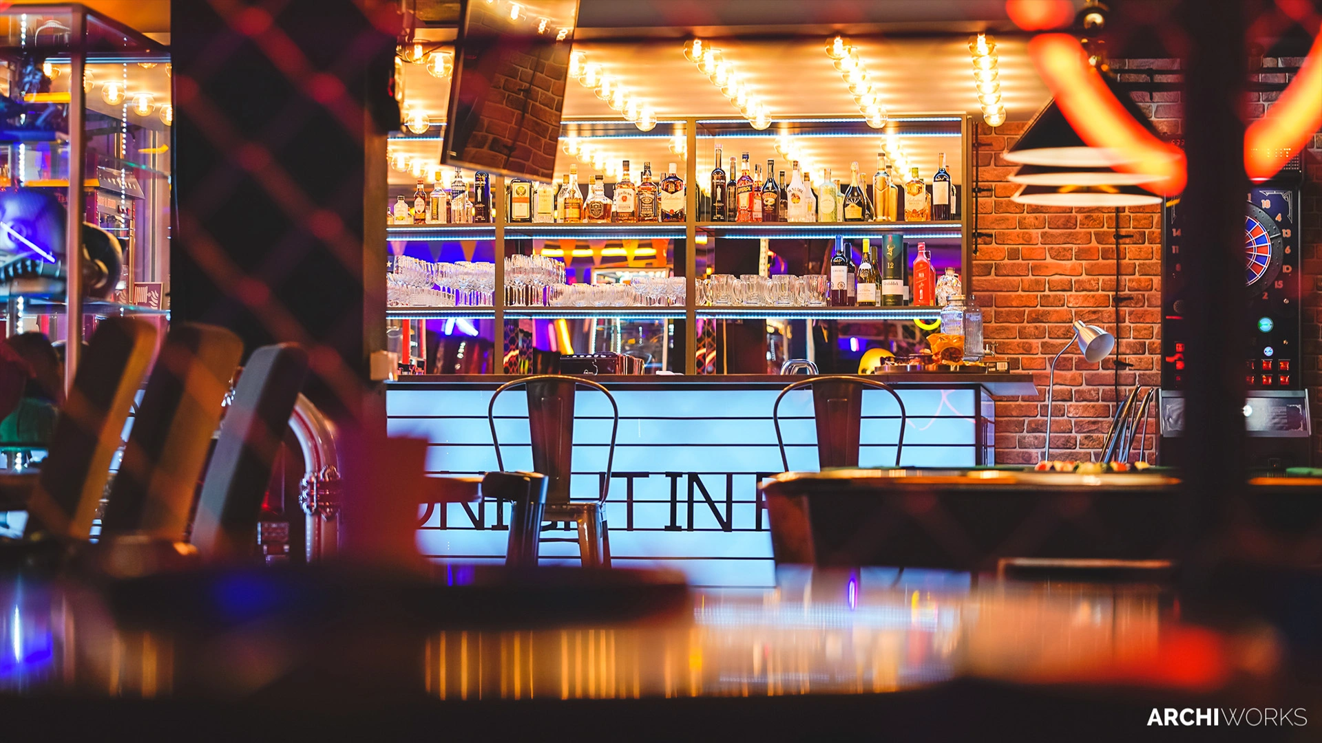 Projekt przestrzeni barowo-rozrywkowej dla prywatnego inwestora to wyrazisty miks estetyki retro z klimatem neonowego blichtru lat 80. i 90. Wnętrze zostało zaprojektowane jako osobna rzeczywistość — nostalgiczną, ale w pełni współczesną. Na pierwszym planie gra światło: kolorowe neony, podświetlane gabloty z kolekcjonerskimi hełmami oraz charakterystyczny sufit z żarówkami tworzą aurę rodem z dawnych kin czy automatów do gier. W przestrzeni znalazły się również klasyczne flippery, stół bilardowy i automat Pong, a całość dopełniają skórzane sofy typu chesterfield, ceglane ściany i detale w stylu vintage. Bar z podświetlanym frontem inspirowany jest ladą biletową kina — każdy element tej przestrzeni opowiada historię o kulturze gier, filmu i rozrywki sprzed kilku dekad. Archiworks stworzyło miejsce, które balansuje na granicy nostalgii i współczesnego komfortu, idealne do spotkań, zabawy i zanurzenia się w atmosferze minionych lat.