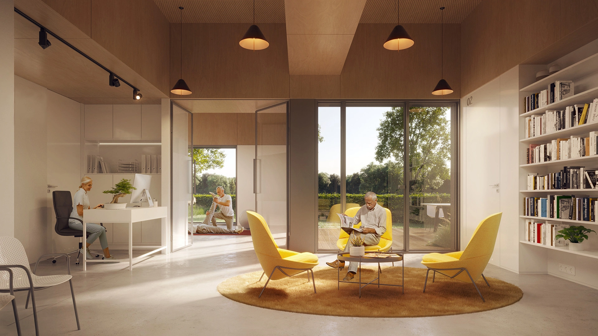 Klinika rehabilitacji Recover to kameralny ośrodek stworzony z myślą o regeneracji ciała i spokoju ducha. Zaprojektowana jako zespół dwóch nowoczesnych brył o archetypicznej formie domu, łączy naturalne materiały – drewno i tynk – z dużymi przeszkleniami otwierającymi wnętrza na zieleń. W środku panuje domowa atmosfera: ciepłe światło, miękkie dywany, biblioteka i przytulne strefy wypoczynku. Dzięki dużym przeszkleniom, przestrzeń pozostaje jasna i pełna życia. Projekt opiera się na prostocie, harmonii i funkcjonalności – oferując komfort zarówno pacjentom, jak i terapeutom.